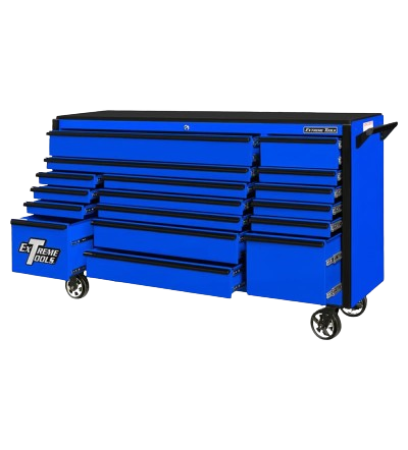 Tags: Extreme Tools, 17 Drawer Roller Cabinet, DX Series, Professional Tool Storage, 72 Inch Tool Cabinet, Black Tool Chest, Blue Drawer Pulls, Heavy-Duty Cabinet, Industrial Tool Storage, MDF Work Surface