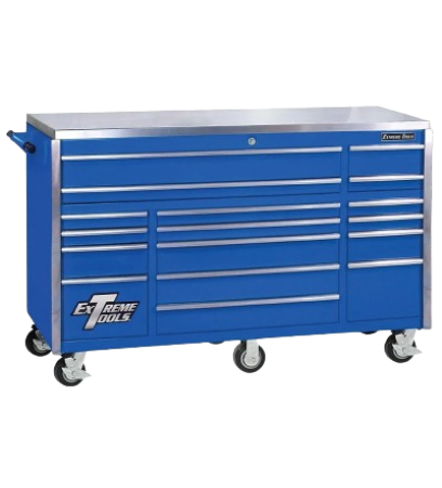 Tags: Extreme Tools, 17 Drawer Cabinet, Triple Bank Roller Cabinet, Professional Tool Box, 72 Inch Tool Cabinet, Blue Tool Storage, Heavy-Duty Roller Cabinet, Industrial Tool Chest, Stainless Steel Work Surface